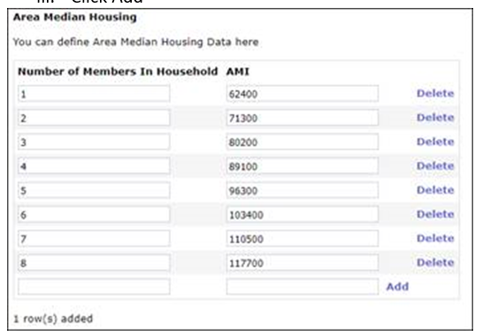 - Enter the local AMI for household sizes into the Area Median Housing table