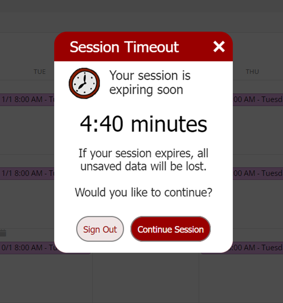 Five minutes before the session expires, iCarol will display a Session Timeout warning: