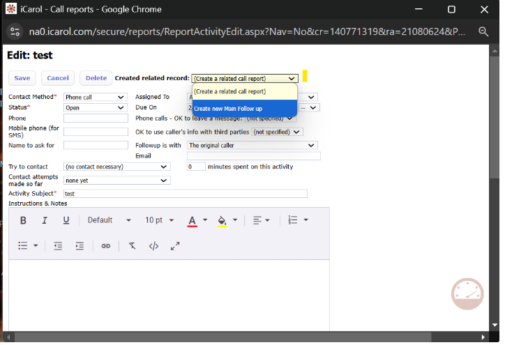 If you choose, you can turn on a setting that will allow you to complete follow-up activities via SMS/Text messages from within a call report. To turn this setting on, you must be an Admin in iCarol.