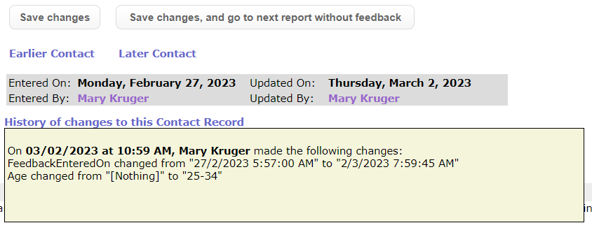 Whenever you make a change to your Contact Records, who, when and what change was made will be added to the History of Changes automatically. You can view the history of changes by navigating to the view or edit page of the submitted Contact Record, and clicking on “History of changes to this Contact Record” which will open a panel with change history details, as shown in the screenshot below: