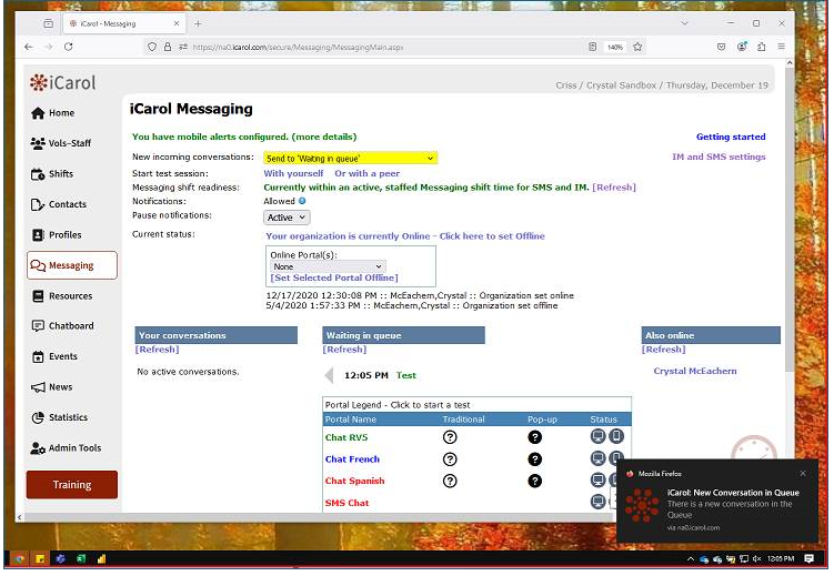 Users will receive new conversation pop-up notifications, as long as they have permission to access the related Messaging Portal. These pop-ups make users aware of when new Messaging conversations are 'Waiting in queue', even if that user isn't registered for a messaging shift at that time.