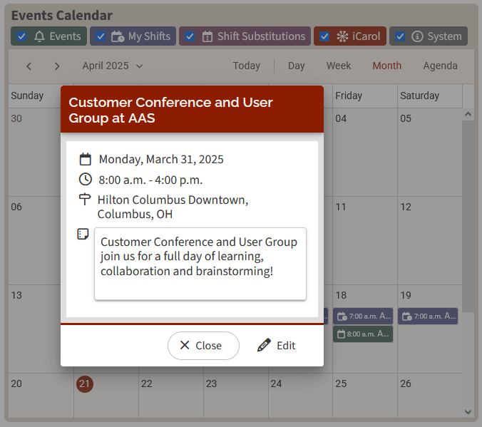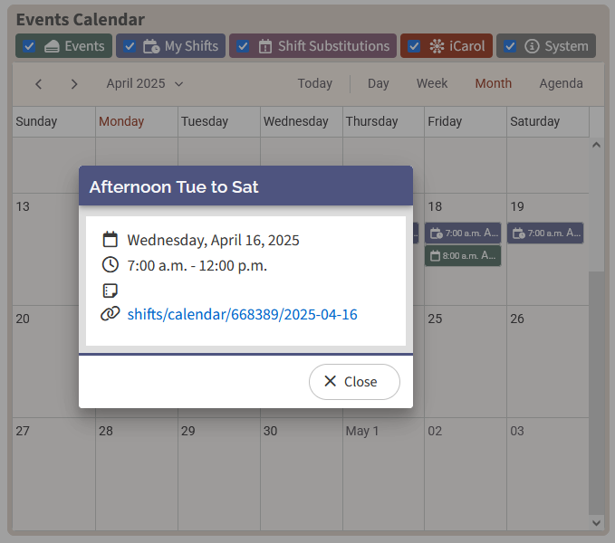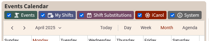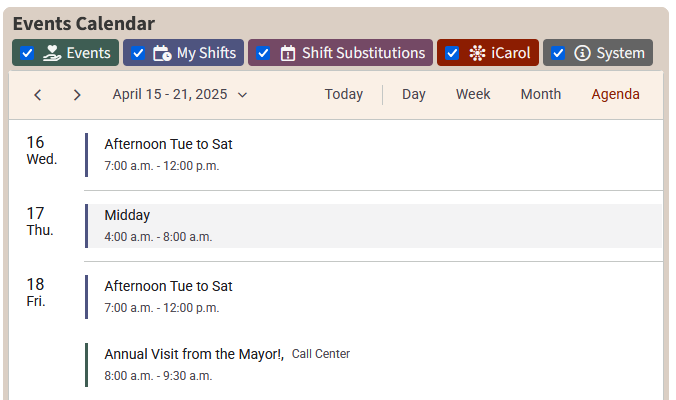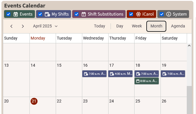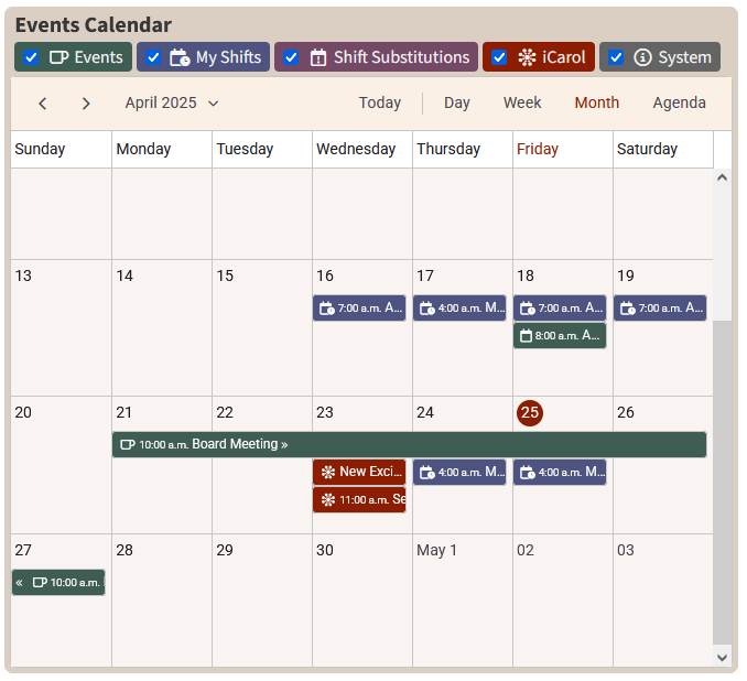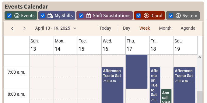 Events are scheduled activities shown on the Events calendar. You can choose what to display during your selected time period, including today, day, week, month, or agenda view. Filters let you pick types of Events to show, including your organization's events, scheduled shifts, shifts needing substitutes, iCarol events like training and maintenance, and system events like when the Shift calendar opens. By using the Events calendar, you can stay organized and ensure you never miss important activities and updates.