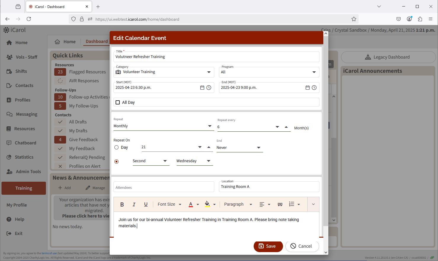 - End Date/Time (In your time zone, these dates/times will display in the Vol-Staff users time zone when viewing)
