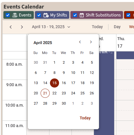 - To see the previous or next day/week/month, navigate using the arrows or drop-down calendar picker at the top of the Events card.