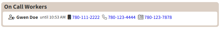 Similar to how the On Call Worker shows on the Contacts Main page, the On Call Workers card automatically shows the contact information for those working On-Call Shifts. The name of the Vol-Staff who is On-Call is displayed, along with their contact information from their Vol-Staff profile in preferred order.