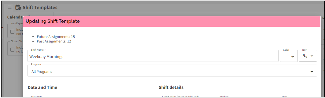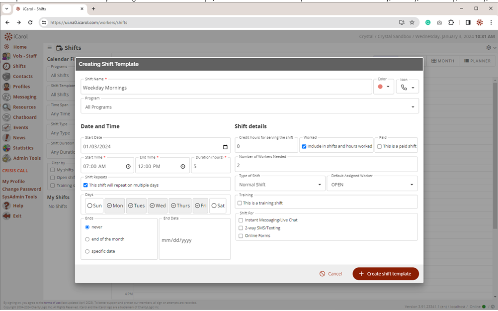 - You can differentiate between a "normal shift" or "on call/support worker" shift and specify credit hours for serving the shift (which may be different than the actual hours of the shift).