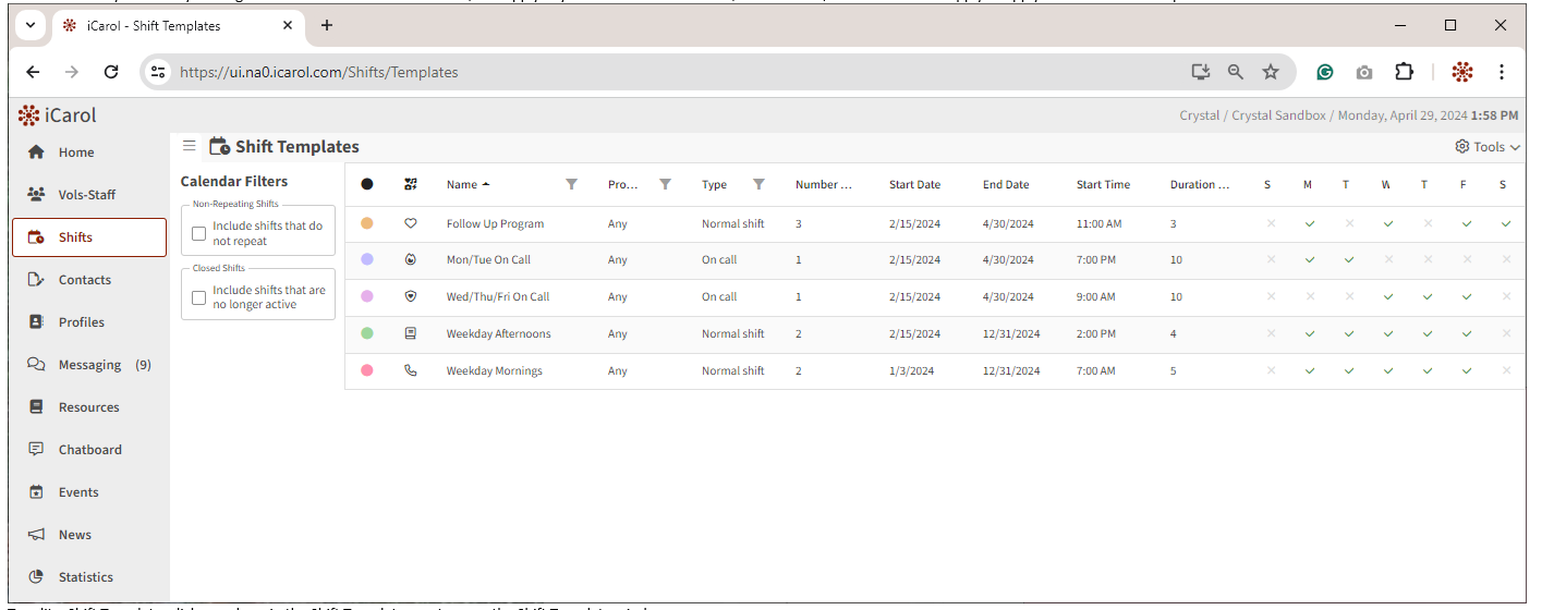 Important Note: In 2024, iCarol released an update to the Shifts feature within iCarol. This update includes a mobile responsive design, modernized and simplified workflows, and enhancements for filtering and viewing the Shift Calendar. iCarol Support is working with individual customers to upgrade their Shifts to the new functionality. Please reach out to iCarol Support if you are interested in an upgrade. The instructions below are specific to the Shifts upgrade. If your iCarol system has not yet been upgraded, please view the legacy Shifts knowledge base articles.