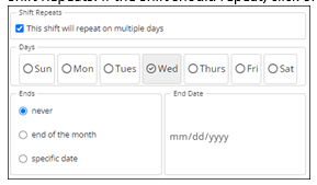 iv. Shift Repeats: If the Shift should repeat, click on “This shift will repeat on multiple days”, this will open additional scheduling options: