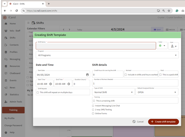 1. Logging into iCarol as an Administrator or user with permission to create Shift Templates