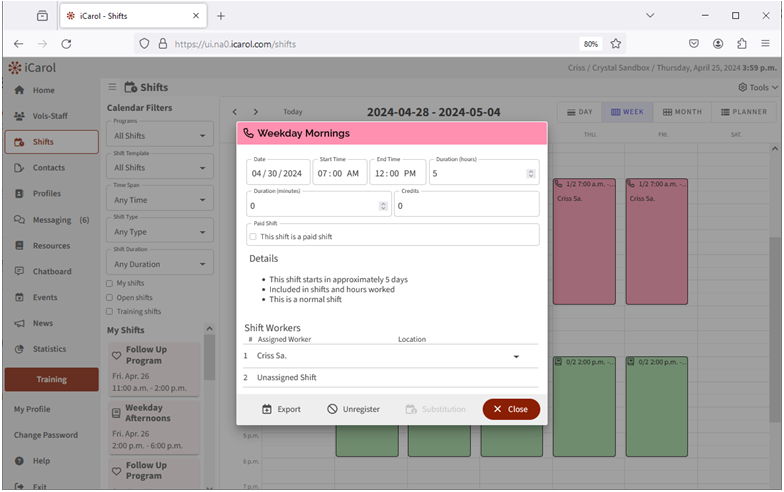- depending on your system settings, basic users can unregister for shifts themselves a certain number of days before the shift is scheduled to occur