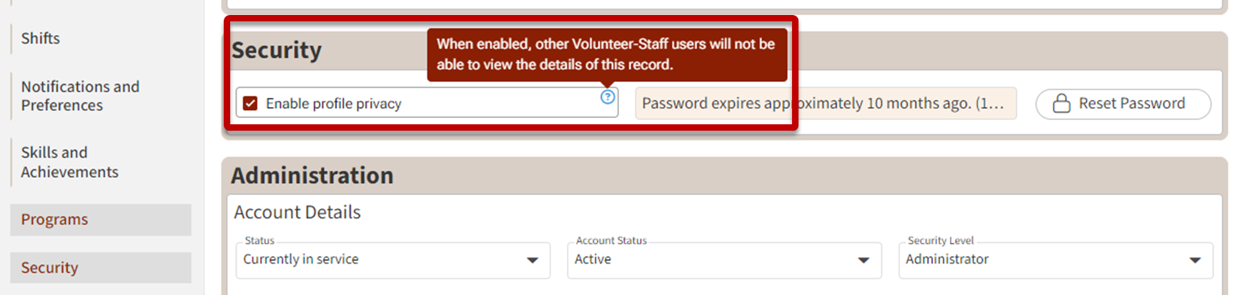 - Security: Allows the vol-staff user to modify privacy settings for their vol-staff record, and access to the Reset Password