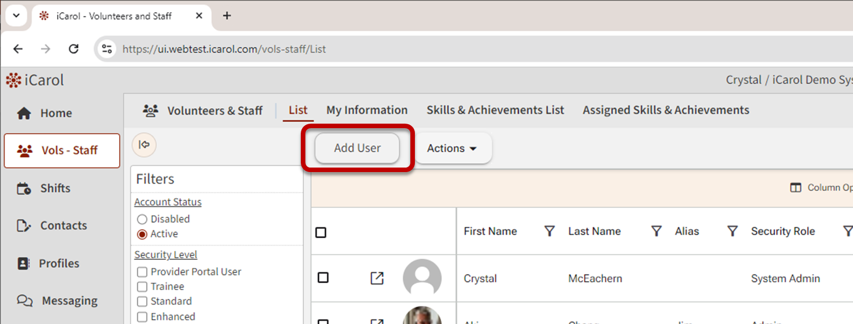 - Administration: Is available to Admin and Supervisors, but only when viewing the vol-staff records of others. This area includes account status, security levels, roles, additional security options, sign on logs, history of changes and more.