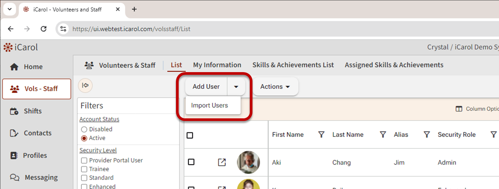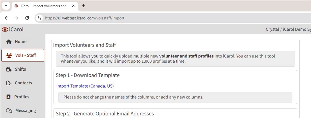 3. Follow the on-screen prompts to download the volunteer-staff import template, once you populate it, upload and import multiple volunteers-staff users