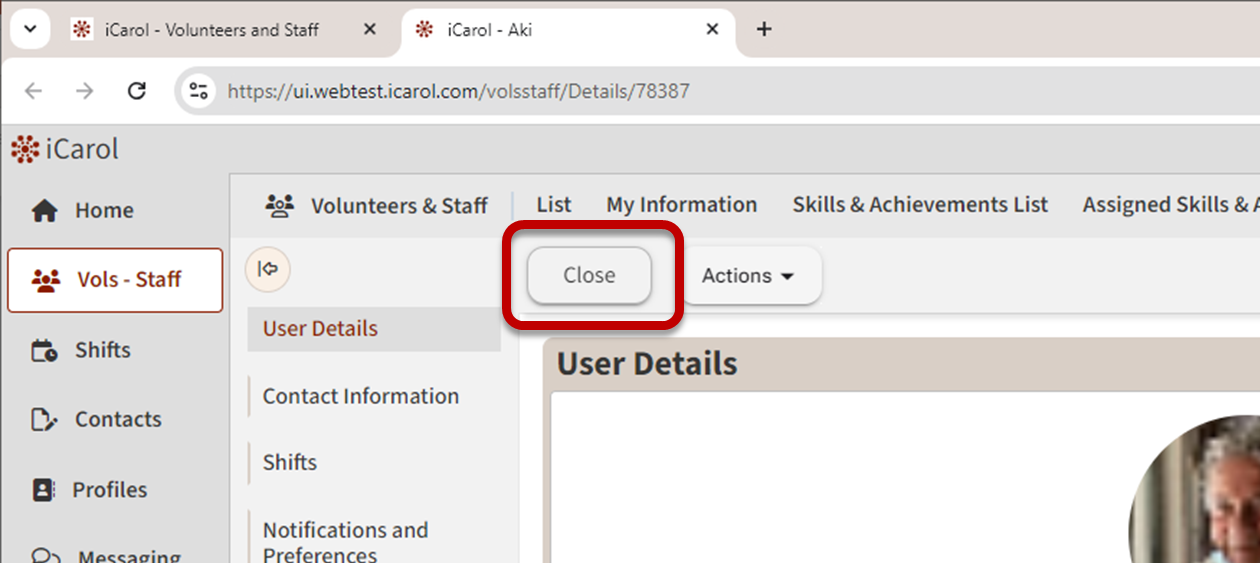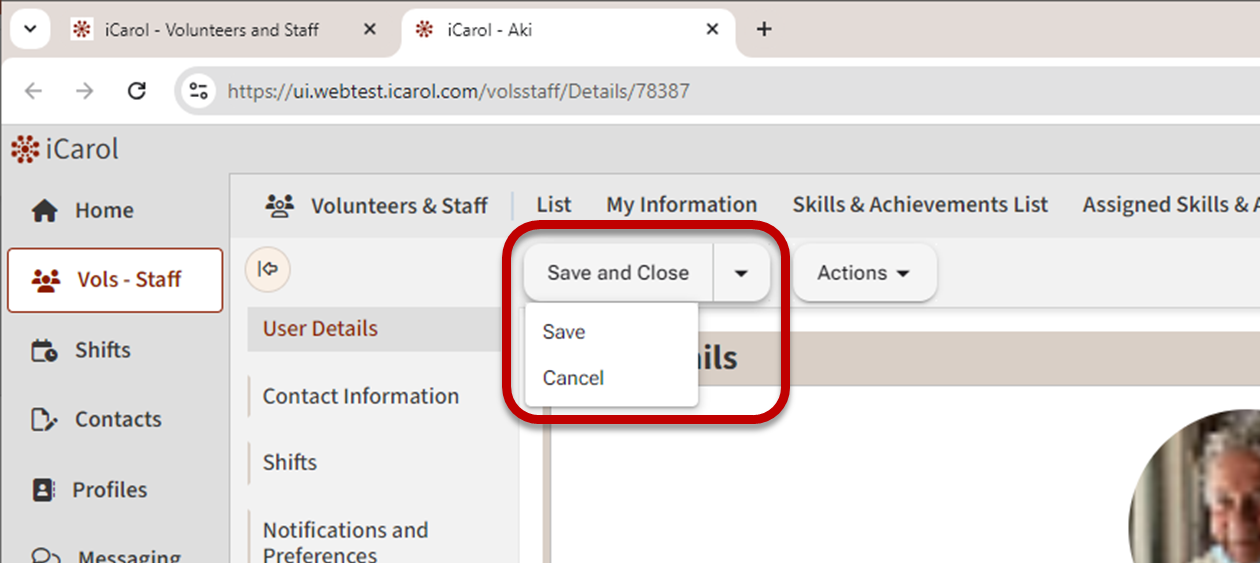 - “Save” will save any changes while keeping the Vol-Staff record details open