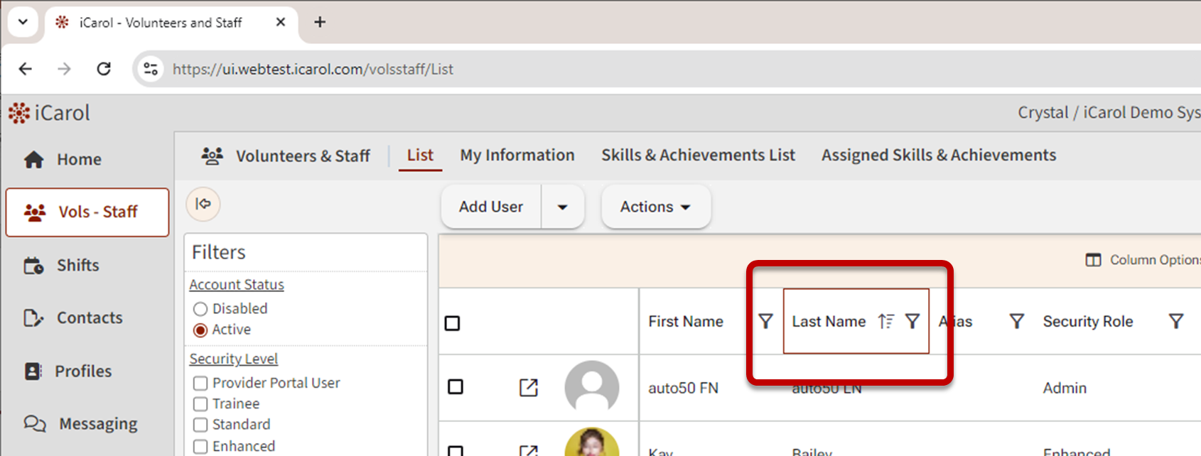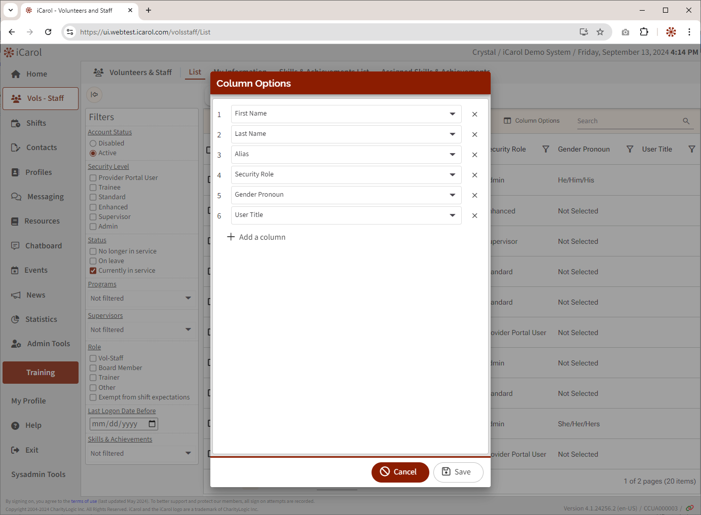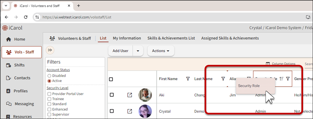 Columns displayed in List view can be configured by each user. iCarol remembers the chosen columns and column order for each user and will display those columns by default the next time the user visits Vol-Staff.