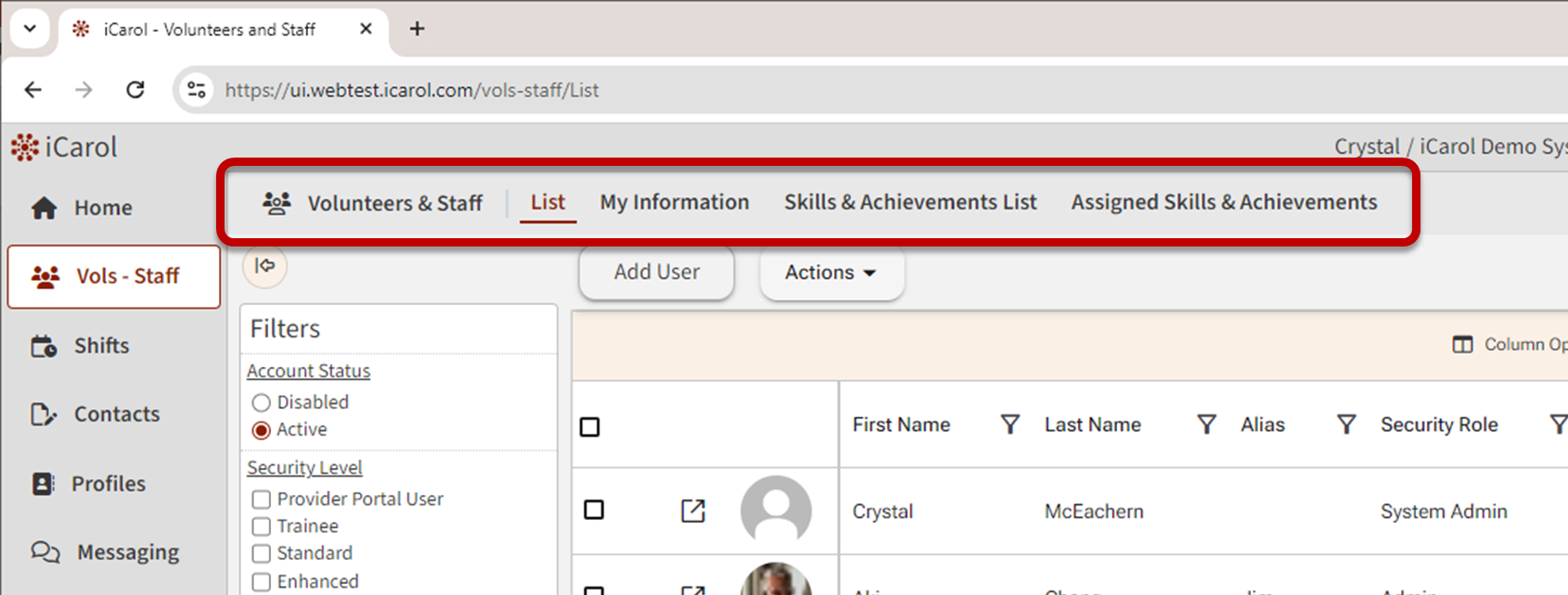The Volunteer-Staff feature has common navigation tools and workflows, including: