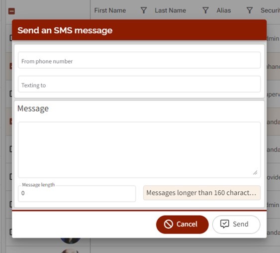 Allows you to send an SMS message (when enabled) to the selected volunteer-staff users. From the popup window, enter the desired message content, then click “Send” or click “Cancel” to go back.