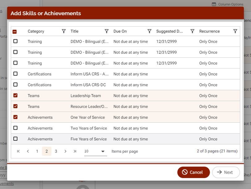 1. Select the skills or achievements you would like to assign then click "next"