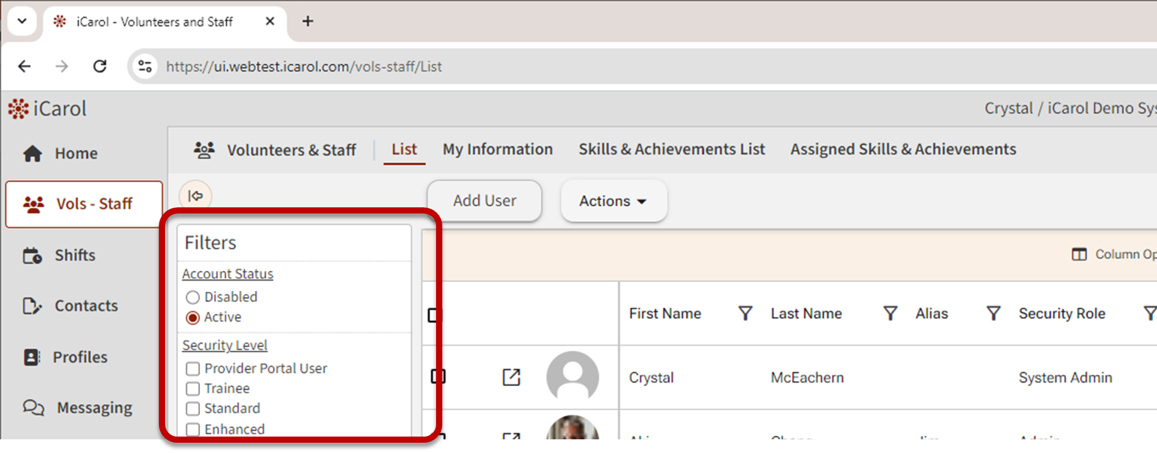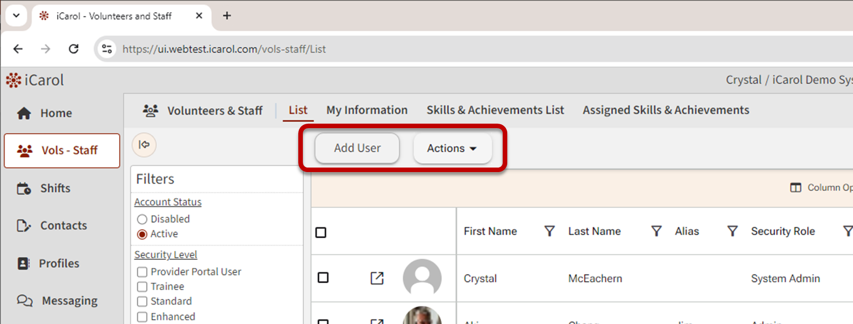 In the List view, users with permission can create new volunteer-staff users and search for and filter existing users. Administrators and users with permissions can also complete bulk actions, such as assigning users to Skills & Achievements, Programs, and making basic changes such as status, assigned supervisor, start date, and more to one or more users.