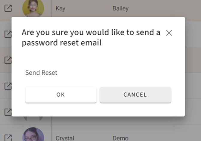 Allows you to reset the password for multiple volunteer-users. From the popup message, click “Ok” to reset, or “Cancel” to go back