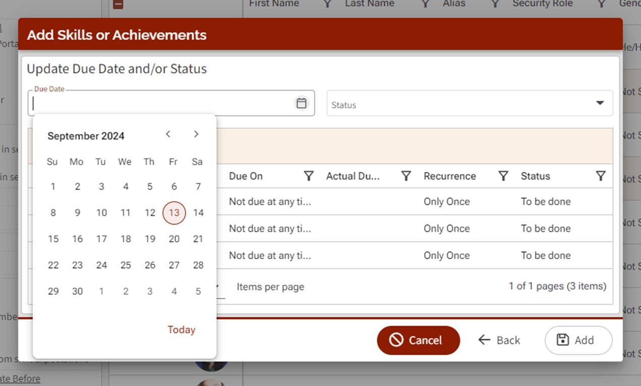 2. Choose a Due Date and Status to update all skills or achievements or modify each individually.