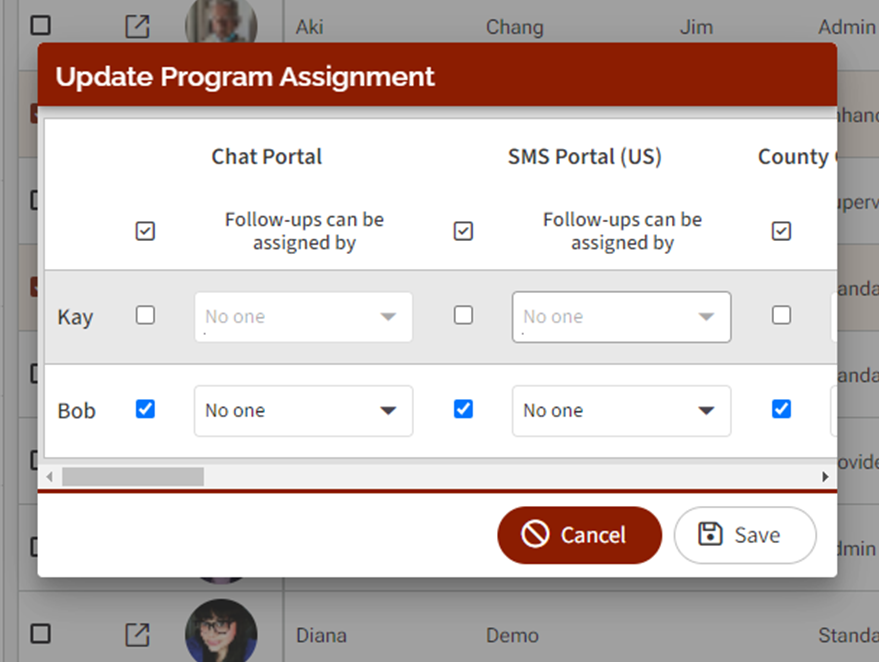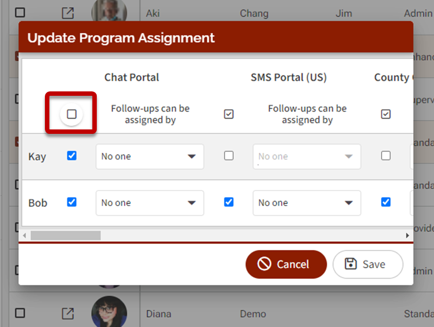 1. Click on the checkbox under each Program to select or unselect that volunteer-staff user from the Program
