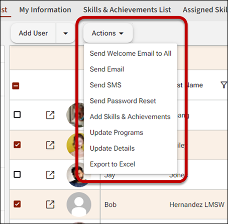 Bulk actions allow you to send multiple messages or make mass changes to all selected volunteer-staff records.