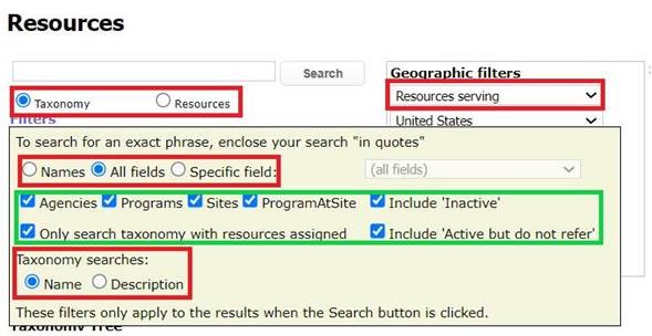 - If only a Country (for example, United States) is entered in the geographic filters, then all resource records with any assigned coverage area will return in your search results. So for example, if you enter the country United States in the geographic filters, your search results will include all resource records that have an assigned coverage area of the United States, a state in the US, or any county, any city or any ZIP Code located in the US.