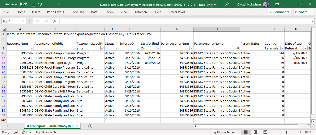 Resource Referral Counts (aka: “weeding”, “pruning”, etc.): This file lists all the resources including names, ids, status, entered and last verified dates, and parent record information. This report also includes the Count of Referrals made to those records in the last 12 months, and to further assist the use of this report, the date of the last referral. The idea with Resource Database pruning is to look for resources that have received few referrals, then review those records with your “Weeding/Pruning” policy.