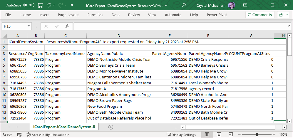 Example of Resource Record Counts export file Resources without ProgramAtSite: This file is intended to help Resource Managers using ProgramAtSite records. This file includes all Programs and Site records, with their parent agency and a count of ProgramAtSite records for each. This file makes it easier for Resource Managers to identify Programs or Sites without a connection to what or where the program is offered.